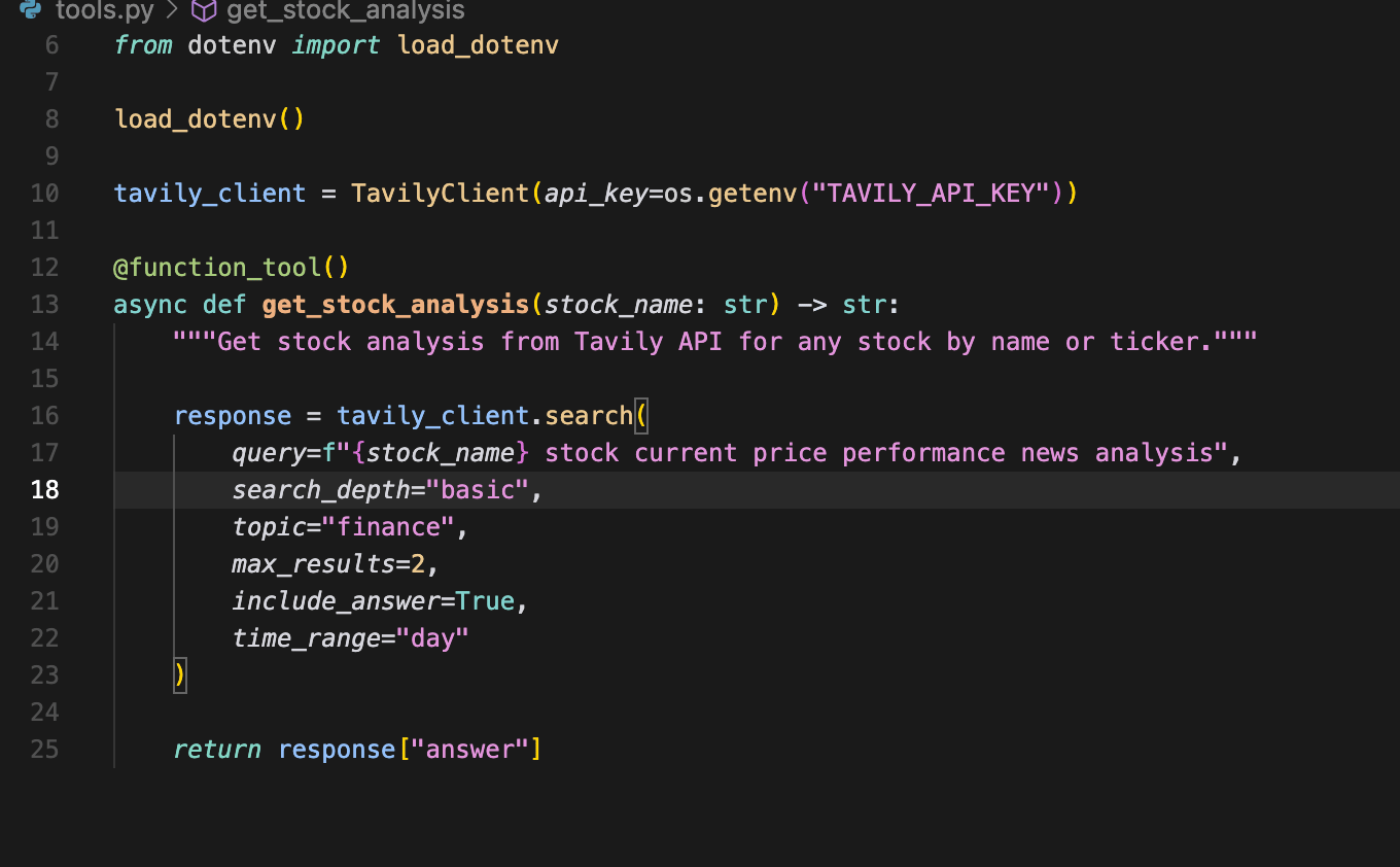 Define a function called get_stock_analysis. It will take a stock_name as input. Inside, use the Tavly client to search. Set the query to include the stock name, price, and performance. Use search_depth='basic' and topic='finance'. Crucially, set include_answer=True. The function should then return just the answer from the Tavly response.