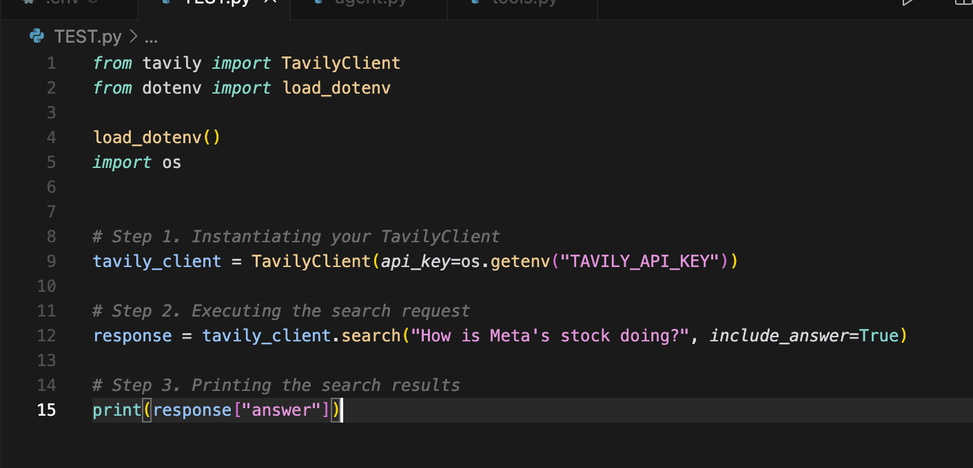 Create a new file called test.py. Import the Tavly client and load your environment variables. Use os.getenv("TAVLY_API_KEY") to get your key. Then, make a search request, for example, tavly.search(query="how is Tesla stock doing?", include_answer=True). Print the answer from the response: print(response["answer"]). Run this script using python3 test.py to see how it works.